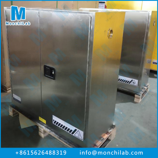 Chemical-resistant safety cabinet designed for secure storage of chemicals, solvents, acids, pharmaceuticals, and gas cylinders in laboratories. Provides fire resistance, leak protection, and ventilation for safe handling of hazardous substances.