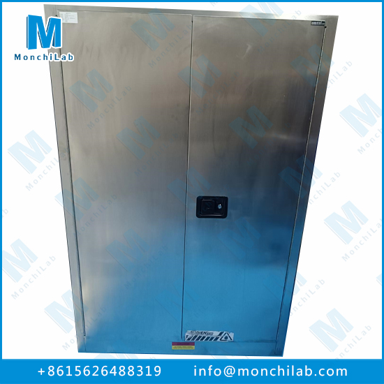Chemical-resistant safety cabinet designed for secure storage of chemicals, solvents, acids, pharmaceuticals, and gas cylinders in laboratories. Provides fire resistance, leak protection, and ventilation for safe handling of hazardous substances.